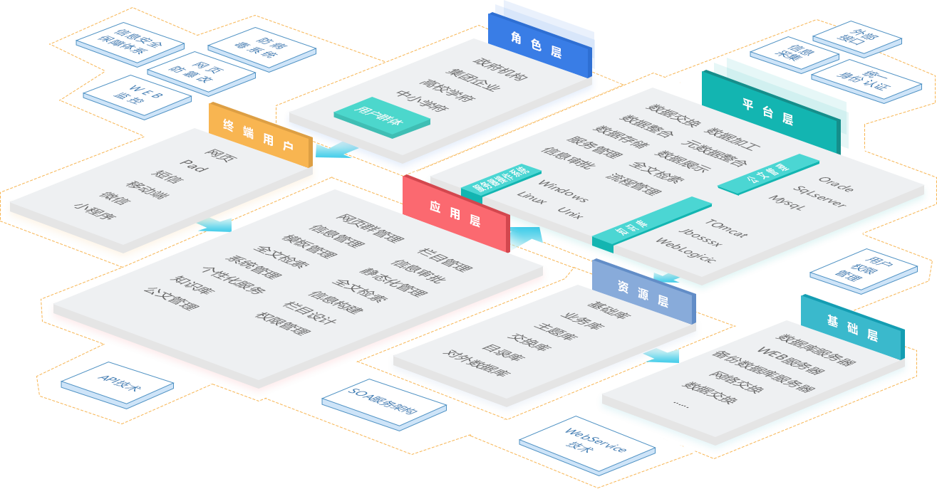 元數(shù)據(jù)管理、多維分類管理、復(fù)雜流程審批、網(wǎng)上辦事、場(chǎng)景服務(wù)、資源目錄服務(wù)、網(wǎng)站SAAS服務(wù)