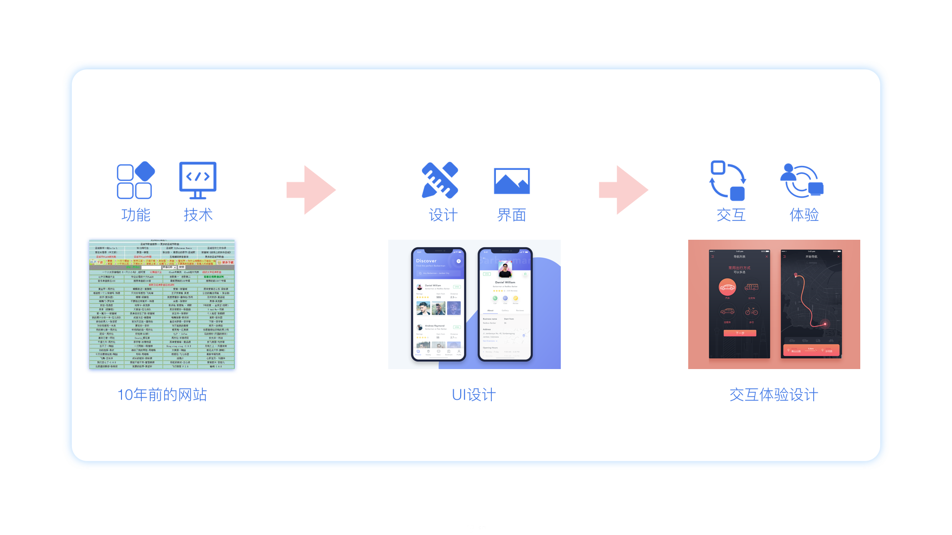 舉個例子:十年前,網(wǎng)站盛行,技術(shù)當(dāng)?shù)?。那時候?qū)τ谟脩魜碚f更關(guān)注的是功能,網(wǎng)站使用過程中體驗的更多的是有沒有這個功能,能不能使用等。當(dāng)網(wǎng)站發(fā)展到一定程度后,人們的焦點從功能轉(zhuǎn)移到外觀,這時候出現(xiàn)了大量的UI設(shè)計師。到最后人們的焦點又從外觀轉(zhuǎn)移到體驗的時候,這時才真正的出現(xiàn)了所謂的交互設(shè)計。