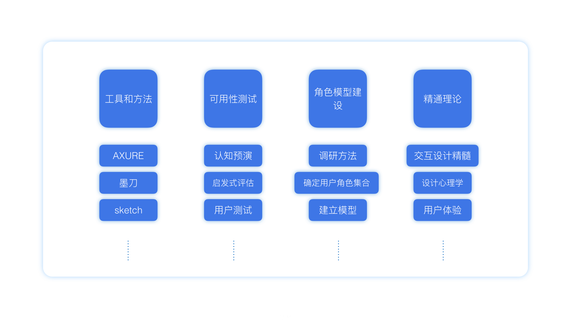 我覺得交互設(shè)計師應(yīng)該需要熟練掌握交互工具和方法(Axure、可用性測試、角色模型建設(shè),或者精通各種理論),我們需要從4個方面不斷的提升自己。