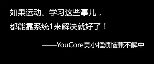 為什么有些人即便在父母的嚴(yán)厲鞭策下考到了牛逼的大學(xué),但在沒有父母鞭策的環(huán)境下就一蹶不振,肆意妄為了呢,原因很大可能就是因?yàn)樵嫉尿?qū)動(dòng)力并非來自自己。這與之前YouCore文章講過的制定目標(biāo)的原理是一樣的(YouCore公眾號(hào)回復(fù)1005獲取),假大空的標(biāo)語是沒辦法促進(jìn)我們的系統(tǒng)1快速思考做出決策的。